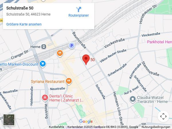 Durch einen Klick auf die Karte gelangen Sie zu der externen Webseite von Google Maps und können sich dort Ihren Routenplan zu uns anzeigen lassen. (© Google)